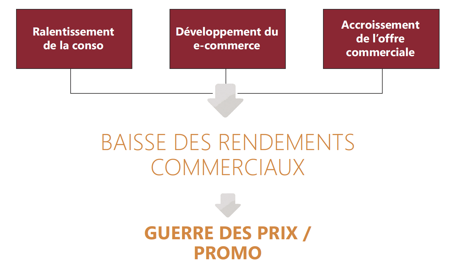 - Paradoxe de la dynamique des GMS actuelles : baisse de la croissance économique, développement du e-commerce et augmentation des m2 commerciaux ⇒ marché qui ne grossit plus, voire qui régresse via la désertion des marchés non alimentaires, et augmentation de la surface commerciale dédiée. Mais aussi ouverture le dimanche…