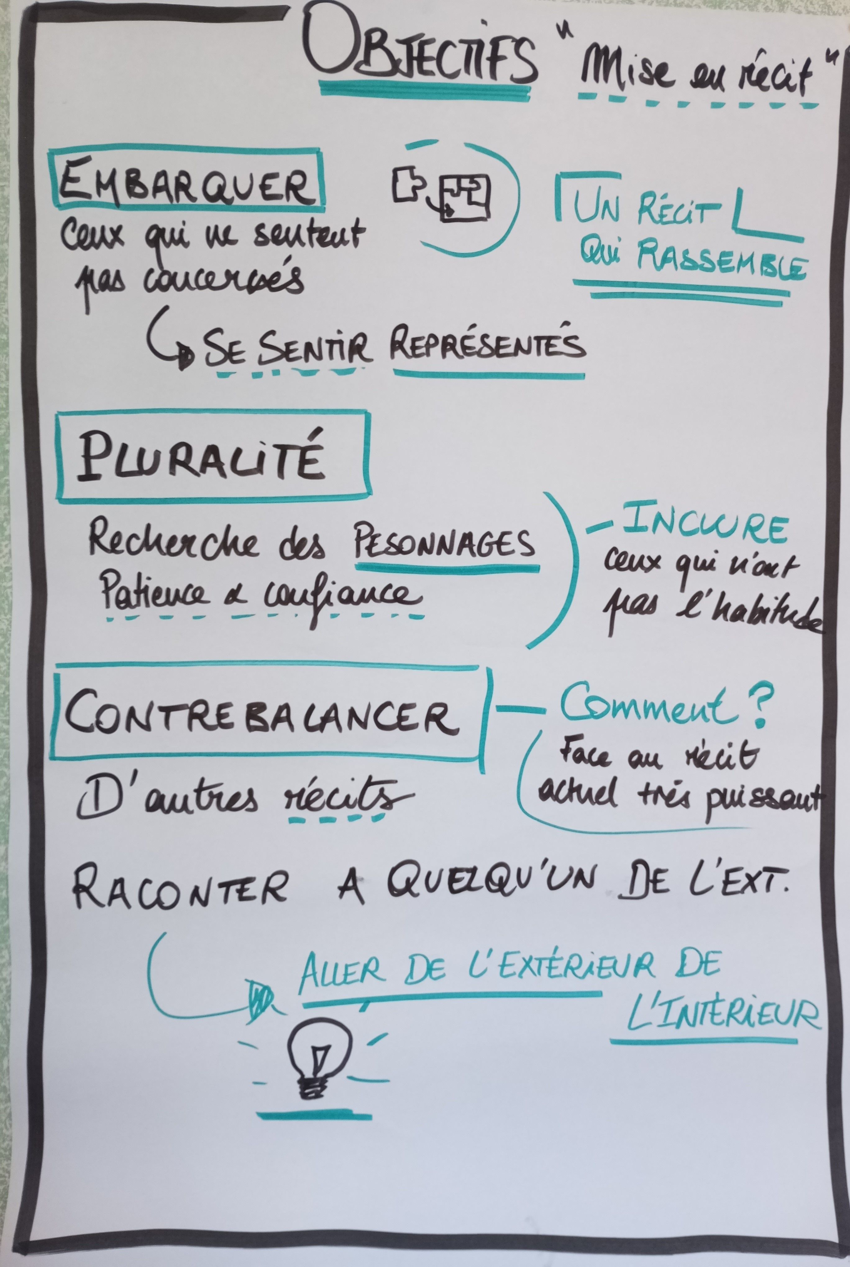 Il y'a le fil, les intentions du projet de territoire et des forums et il y'a l'histoire de la mise en récit, sa mise en abyme. La mise en récit sert à embarquer plus de monde dans le projet de territoire, qu'il y'ait plus de sensibilité dans les transitions et notamment auprès des élus, qu'ils comprennent que c'est déjà une réalité sur le territoire. Pour embarquer les gens, il faut les inclure. Dans notre histoire, ils n'apparaissent pas encore. Tout un pans de personnes qui ne sont pas inclues depuis le départ ne vont pas se sentir concernées. Il manque dans notre trajectoire des pôles d'acteurs. La mise en récit est une action participative qui permet de lier le fond et la forme.