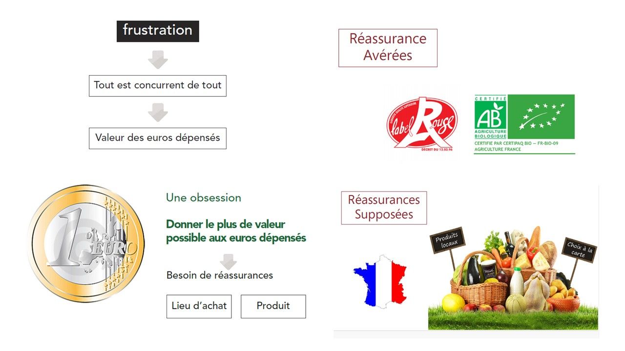 - Face à cette frustration « tout est concurrent de tout » le client a besoin de réassurances pour donner son CONSENTEMENT à payer plus chers. Le lieu d’achat (ex : Grand frais pour les fruits et légumes, Chez un caviste/boucher pour la viande etc..) et le produit (valeur avérées comme les labels bio ou label rouge SIQO..) ou supposées (comme les produits locaux) sont des valeurs qui facilite le consentement.